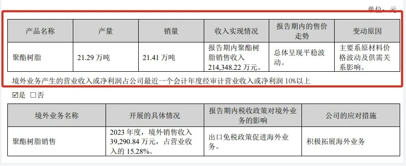 根據(jù)披露,神劍股份2023年聚酯樹脂銷售收入21.43億元,銷量21.41萬噸,2023年的售價(jià)總體呈現(xiàn)平穩(wěn)波動(dòng)。