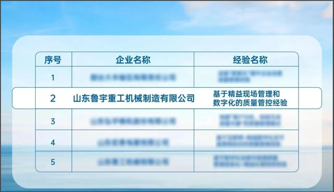 近日,山東省工業(yè)和信息化廳公示了2024年全省質(zhì)量標(biāo)桿企業(yè)名單,魯宇重工“基于精益現(xiàn)場(chǎng)管理和數(shù)字化的質(zhì)量管控經(jīng)驗(yàn)”成功入選為2024年全省質(zhì)量標(biāo)桿企業(yè)。