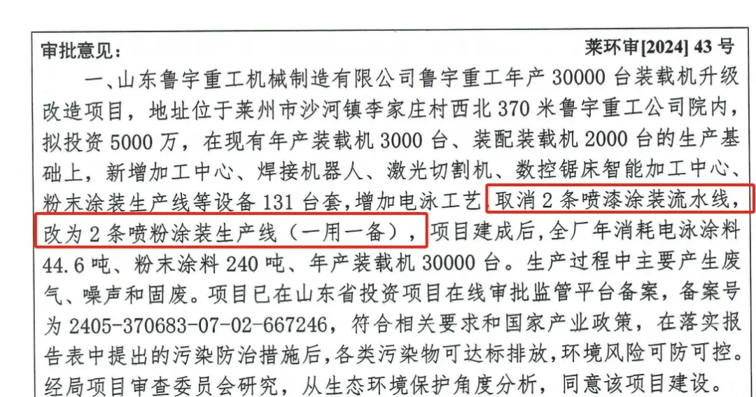 根據(jù)披露,該項(xiàng)目地址位于萊州市沙河鎮(zhèn)李家莊村西北370米魯宇重工公司院內(nèi),擬投資5000萬(wàn),在現(xiàn)有年產(chǎn)裝載機(jī)3000臺(tái)、裝配裝載機(jī)2000臺(tái)的生產(chǎn)基礎(chǔ)上,新增加工中心、焊接機(jī)器人、激光切割機(jī)、數(shù)控鋸床智能加工中心、粉末涂裝生產(chǎn)線等設(shè)備 131臺(tái)套,增加電泳工藝,取消2條噴漆涂裝流水線,改為2條噴粉涂裝生產(chǎn)線(一用一備)。項(xiàng)目建成后,全廠年消耗電泳涂料44.6噸、粉末涂料240噸、年產(chǎn)裝載機(jī)30000臺(tái)。