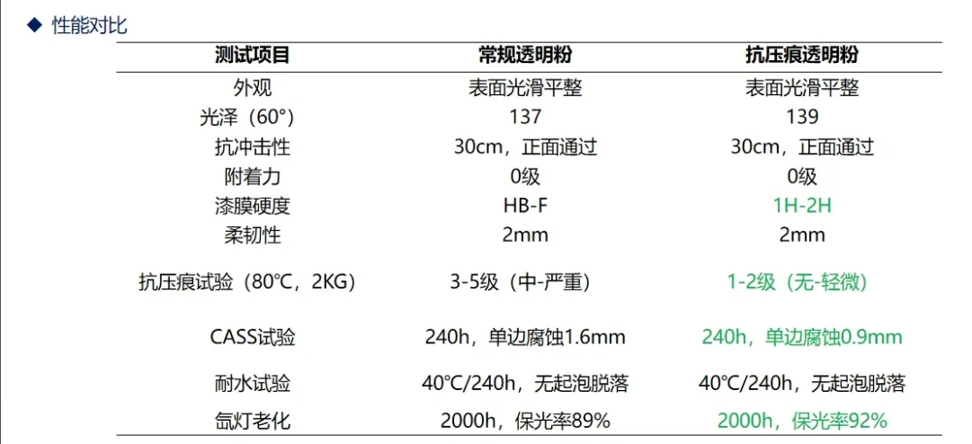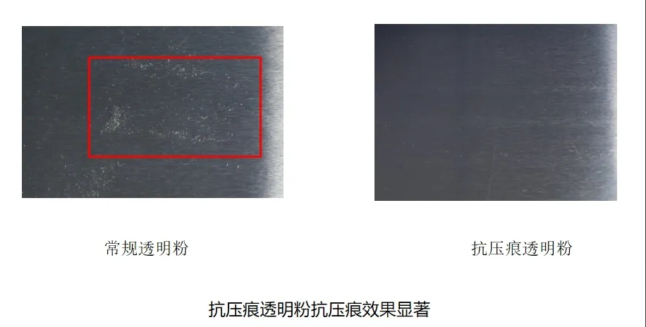 該產品常規(guī)性能與常規(guī)丙烯酸產品相當,完全滿足汽車鋁輪轂的日常罩光要求,但在抗壓痕方面,具有明顯優(yōu)勢。監(jiān)測數據顯示,在常規(guī)產品單程運輸壓痕比例高達60%的情況下,抗壓痕產品并未出現壓痕,改善效果明顯。