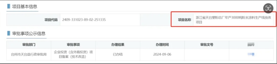 2024年9月6日,浙江省天臺(tái)塑粉總廠(下稱“天臺(tái)塑粉”),年產(chǎn)3000噸粉末涂料生產(chǎn)線技改項(xiàng)目,在臺(tái)州市天臺(tái)縣行政審批局,進(jìn)行企業(yè)投資(含外商投資)項(xiàng)目備案(技術(shù)改造)。