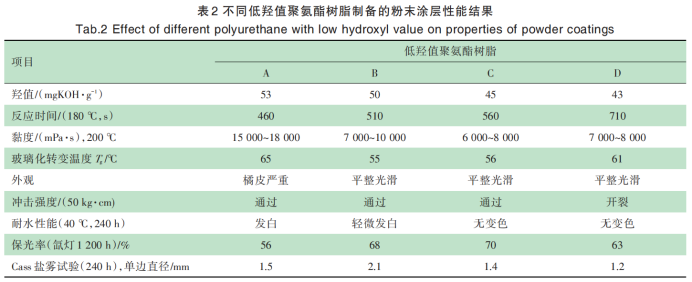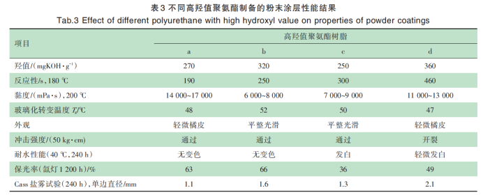 因汽車鋁輪轂罩光用亞光粉末涂料除了對(duì)外觀有肌膚質(zhì)感的要求外,對(duì)耐候性能、流平性能、透明度、耐腐蝕性能都提出不低的要求,故選擇的聚氨酯樹脂需要具備高耐候性、高流平性、高耐腐蝕性等特性。本研究選擇了幾種低羥值和高羥值的聚氨酯樹脂進(jìn)行研究,不同聚氨酯樹脂制備的粉末涂層性能結(jié)果見表2和表3。