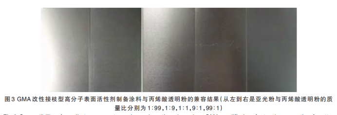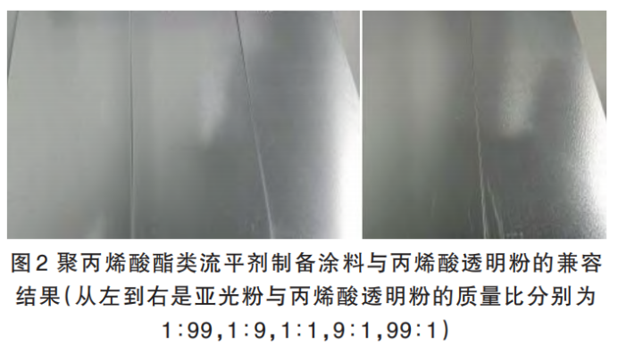 普通市場(chǎng)上常見的流平劑為聚丙烯酸酯類,本研究選擇了幾種廠家的流平劑,在色相、外觀上效果都有差異,但是都存在一個(gè)問題就是都無(wú)法使其制備所得亞光透明粉和丙烯酸透明粉兼容,結(jié)果見圖4,少量丙烯酸透明粉添加到亞光粉里都會(huì)導(dǎo)致出現(xiàn)嚴(yán)重的橘皮現(xiàn)象,甚至縮孔等。因此本研究特意選擇了一種 GMA 改性接枝型高分子表面活性劑,其不僅在外觀上和色相上滿足要求,而且保證了亞光透明粉和丙烯酸透明粉共線不干擾,其兼容情況見圖 3,因此本研究選擇了這種特殊改性的流平劑,同時(shí)經(jīng)過(guò)一些相關(guān)試驗(yàn),用量選擇為 1.0%~1.2%時(shí),涂層性能達(dá)到最優(yōu)。