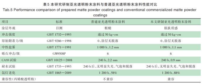 本文研制的亞光透明粉末涂料具備肌膚質(zhì)感的外觀效果,在滿足鋁輪轂技術(shù)涂裝技術(shù)要求的同時(shí),還能與丙烯酸透明粉共線使用,其性能明顯優(yōu)于市場(chǎng)上普通的亞光透明粉末涂料,結(jié)果對(duì)比見表5。