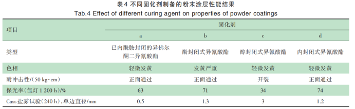 由表4可以看出,已內(nèi)酰胺封閉的異佛爾酮二異氰酸酯(IPDI)固化劑耐腐蝕上要明顯優(yōu)于其他固化劑,但耐候性上則相對(duì)較差。采用酚封閉式異氰酸酯固化劑時(shí),發(fā)黃特別明顯,不適合用于透明粉末涂料。醇封閉式異氰酸酯固化劑理論上在沖擊性、耐候性上應(yīng)該具有良好的性能,但實(shí)際測(cè)試結(jié)果中卻表現(xiàn)不佳,這是由于它自身所需固化溫度較高,需要達(dá)到 200 ℃以上,而在測(cè)試中采用的固化條件無(wú)法滿足其固化,然而本研究的透明粉末涂料在實(shí)際應(yīng)用中為了考慮和丙烯酸共線生產(chǎn)的特殊情況,在固化條件應(yīng)該盡可能接近丙烯酸透明粉的固化條件 180 ℃/(10~15)min。