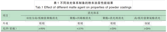 本研究開發(fā)的亞光透明粉末涂料應(yīng)用于汽車鋁輪轂亞光汽車輪,對(duì)光澤有明確的要求,一般要求光澤范圍在20%~70%,因此本研究對(duì)幾種消光體系進(jìn)行研究,不同消光體系制備的粉末涂層性能結(jié)果見表1。