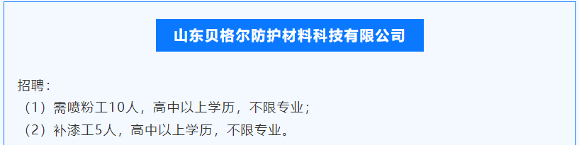 受益于客戶市場增長需求,貝格爾近日發(fā)出招聘公告,需噴粉工10人,高中以上學(xué)歷,不限專業(yè)。具體地址為梁山縣拳鋪鎮(zhèn)通亞路東首路南。
